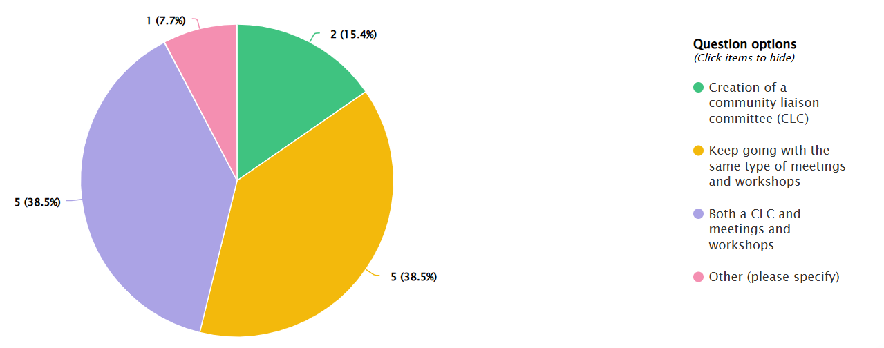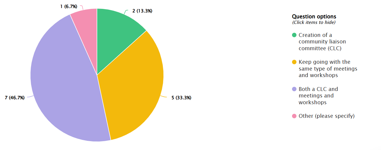 In June, residents were also asked to complete a survey about how they wanted to stay engaged. Most residents shared that they wanted more engagement opportunities with a majority selecting “Keep going with the same type of meetings and workshops” and “Both a CLC and meetings and workshops”.