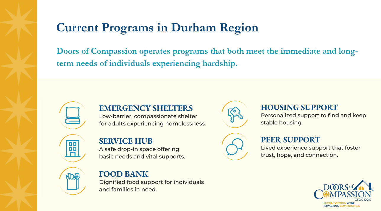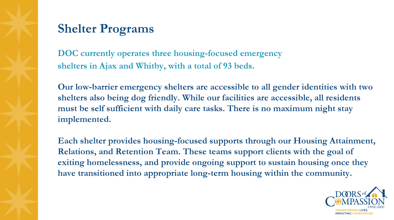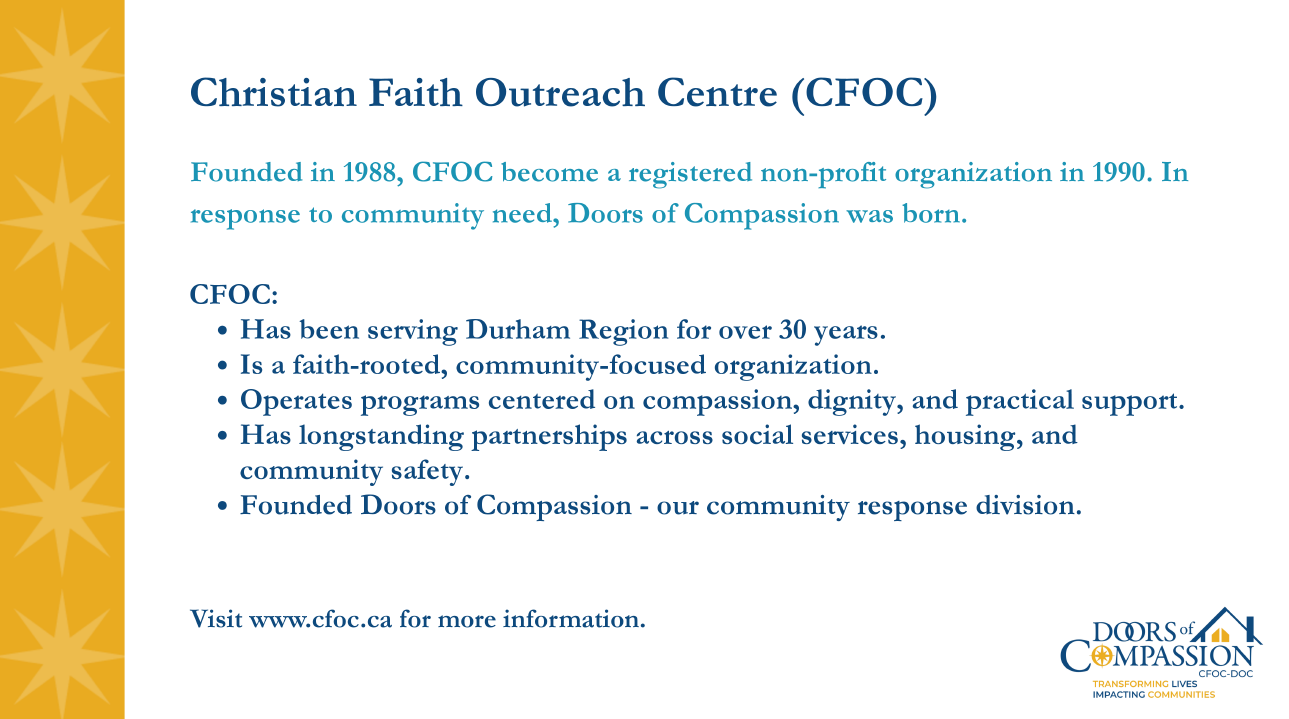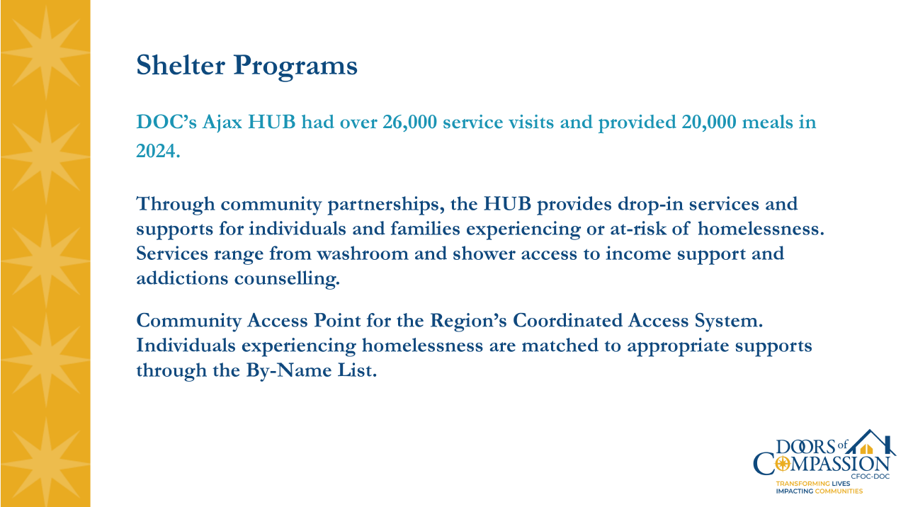 In one of their Durham region locations, CFOC- DOC operates a full-service hub that acts as a community center with wrap-around services. This is different from the Integrated Care Hub in Kingston. CFOC- DOC does not operate a safe-injection site.