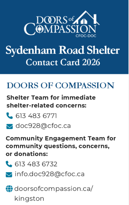 The shelter’s Community Care team conducts proactive outreach—including patrolling the surrounding area, meeting local groups and nearby businesses and responds to concerns with a compassionate approach. Community members can also contact the Doors of Compassion team at: info.doc928@cfoc.ca or 613-483-6732