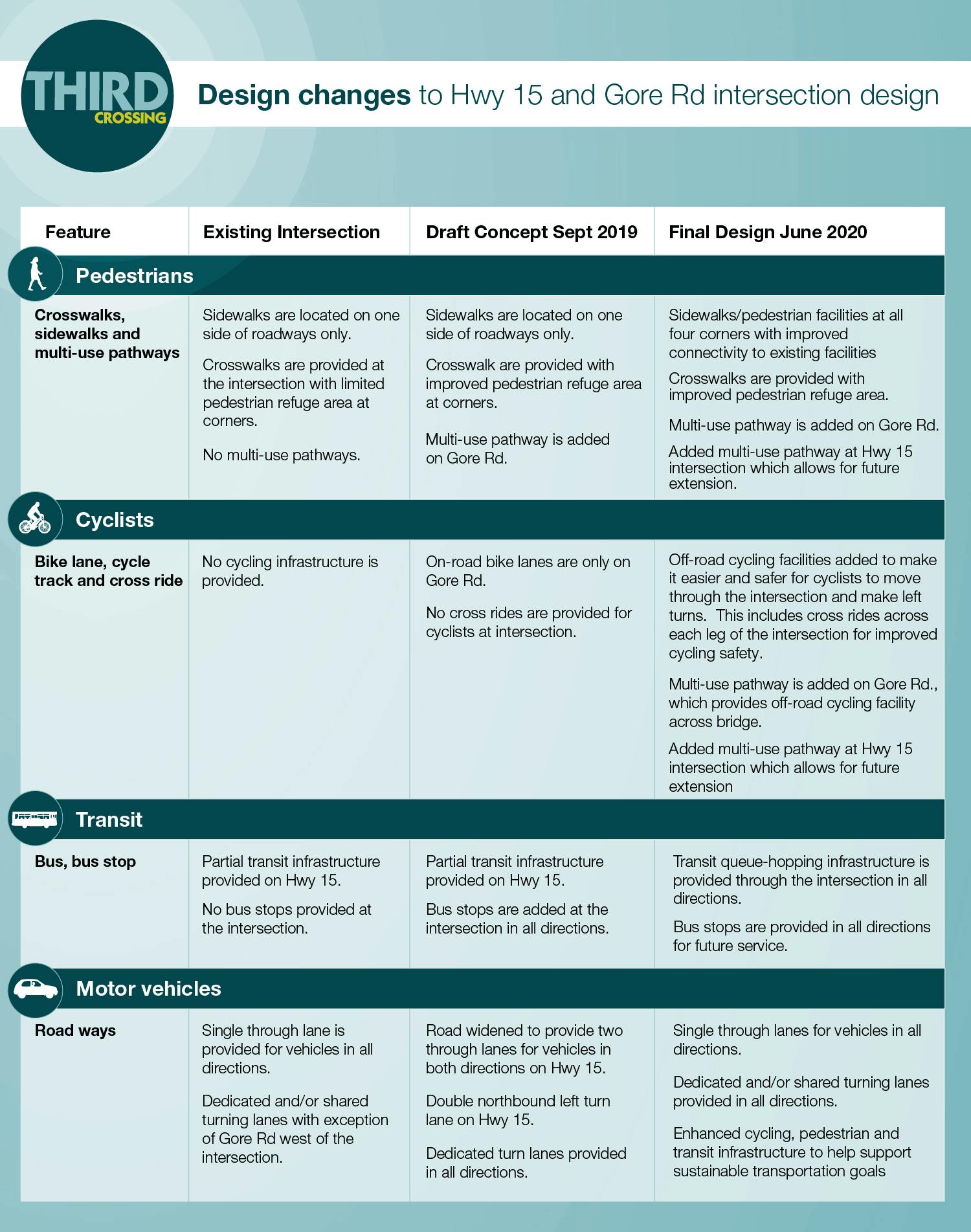 In September 2019, the Third Crossing project team provided a draft concept design of Hwy 15 & Gore Rd intersection. Since then, there have been City-wide decisions based on global and municipal interests which have influenced the final design.