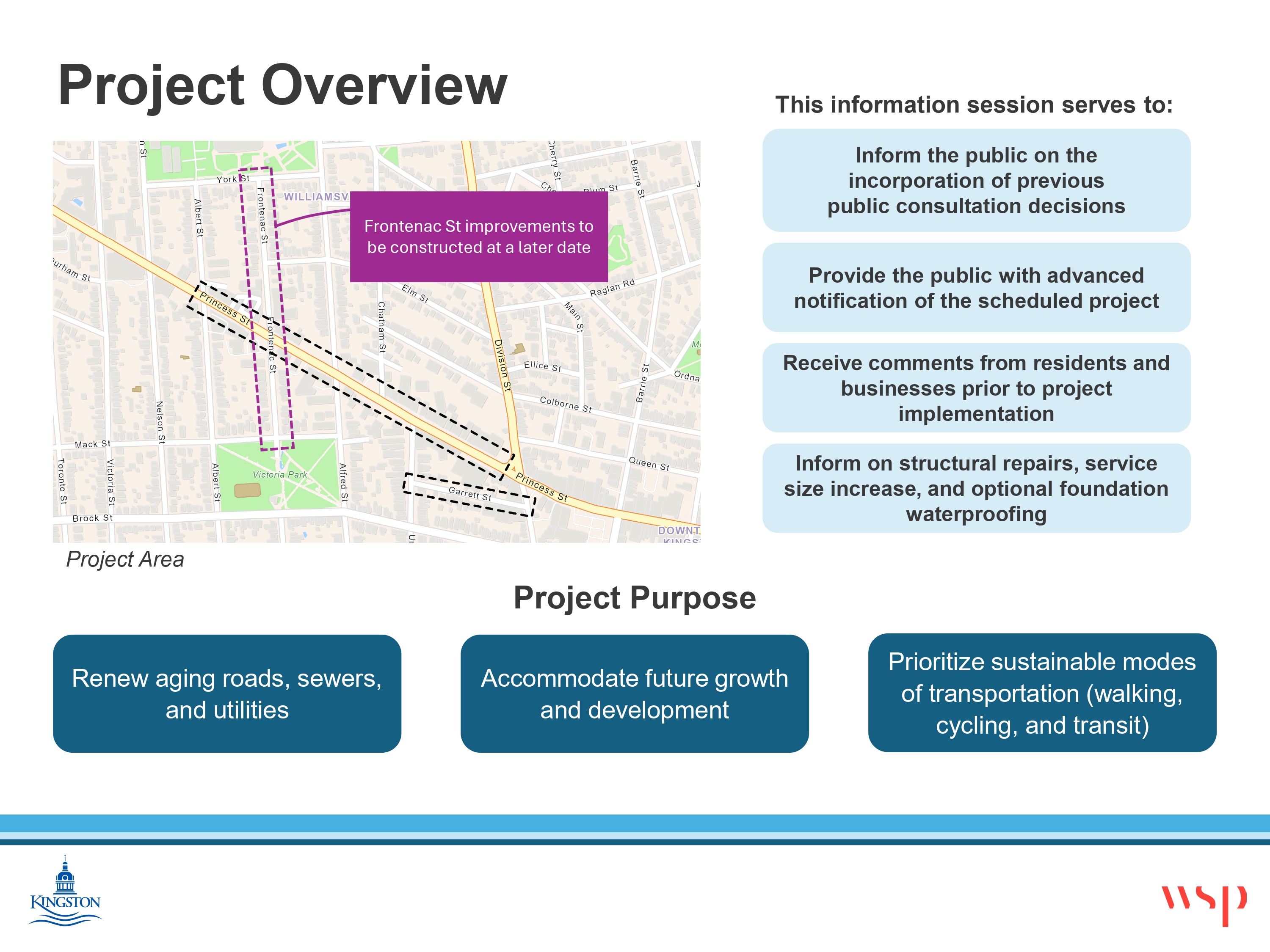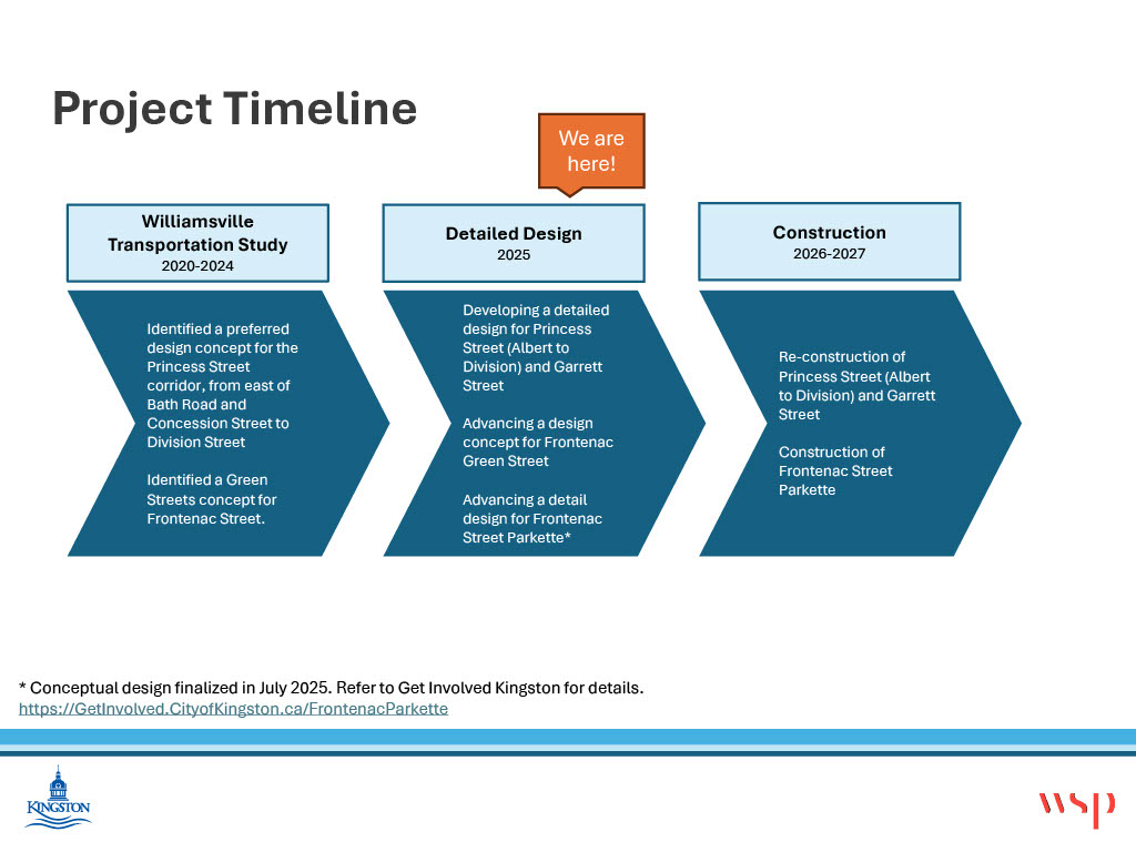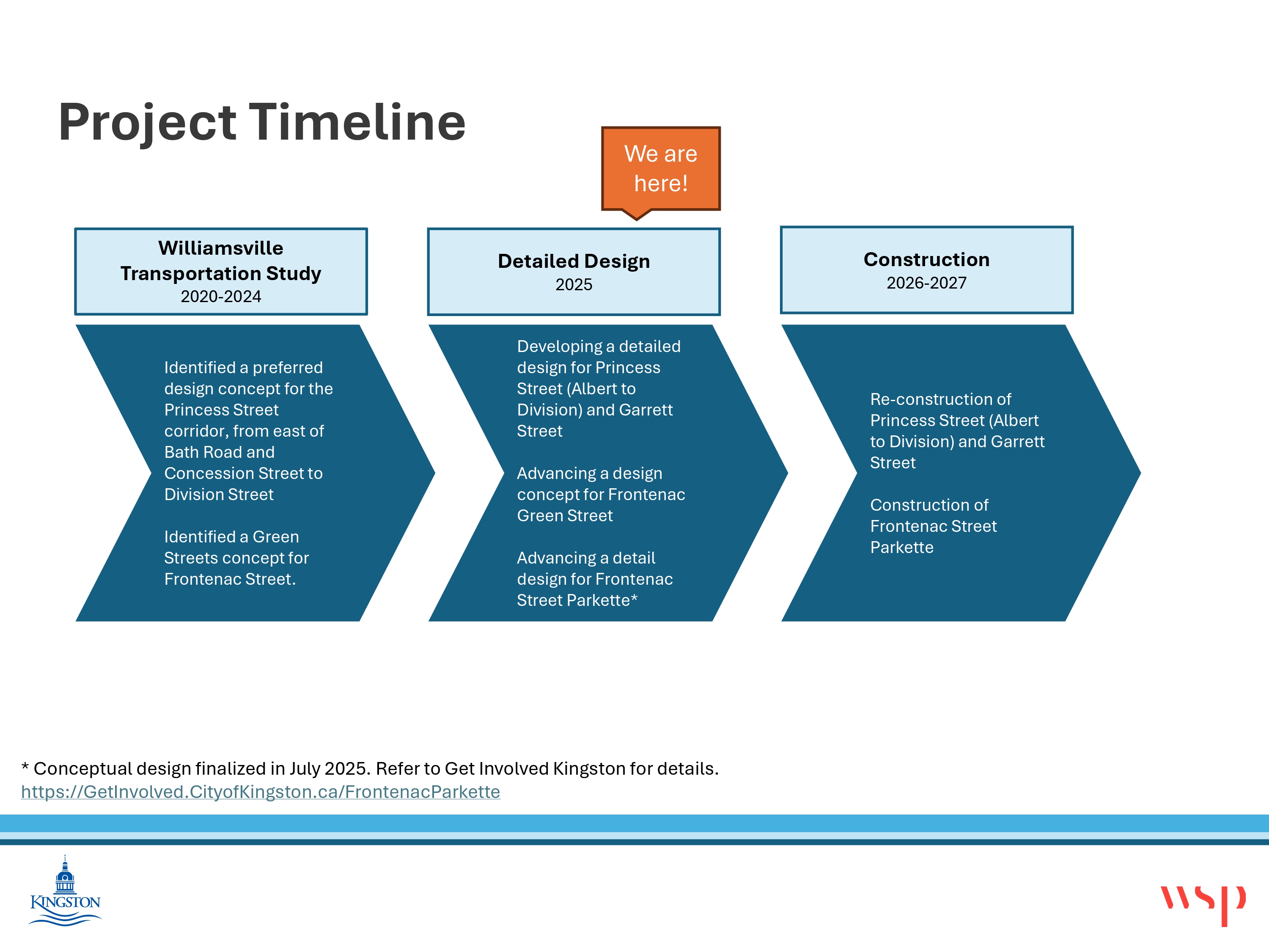 The reconstruction of Princess Street in this area is driven by the need to upgrade the infrastructure and is guided by the Williamsville Main Street Transportation Study, completed in 2024 following extensive public consultation. For more details on that study, please visit the archived project pages on Get Involved Kingston.